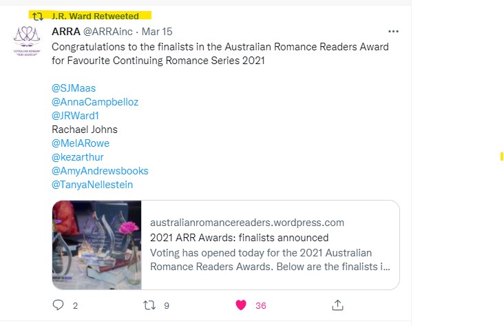 But wait, this gloating moment only gets better, as JR Ward (ohmygosh) shared a tweet with my name in it.